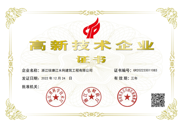 喜报!浙钱水建正式荣获“国家高新技术企业”称号